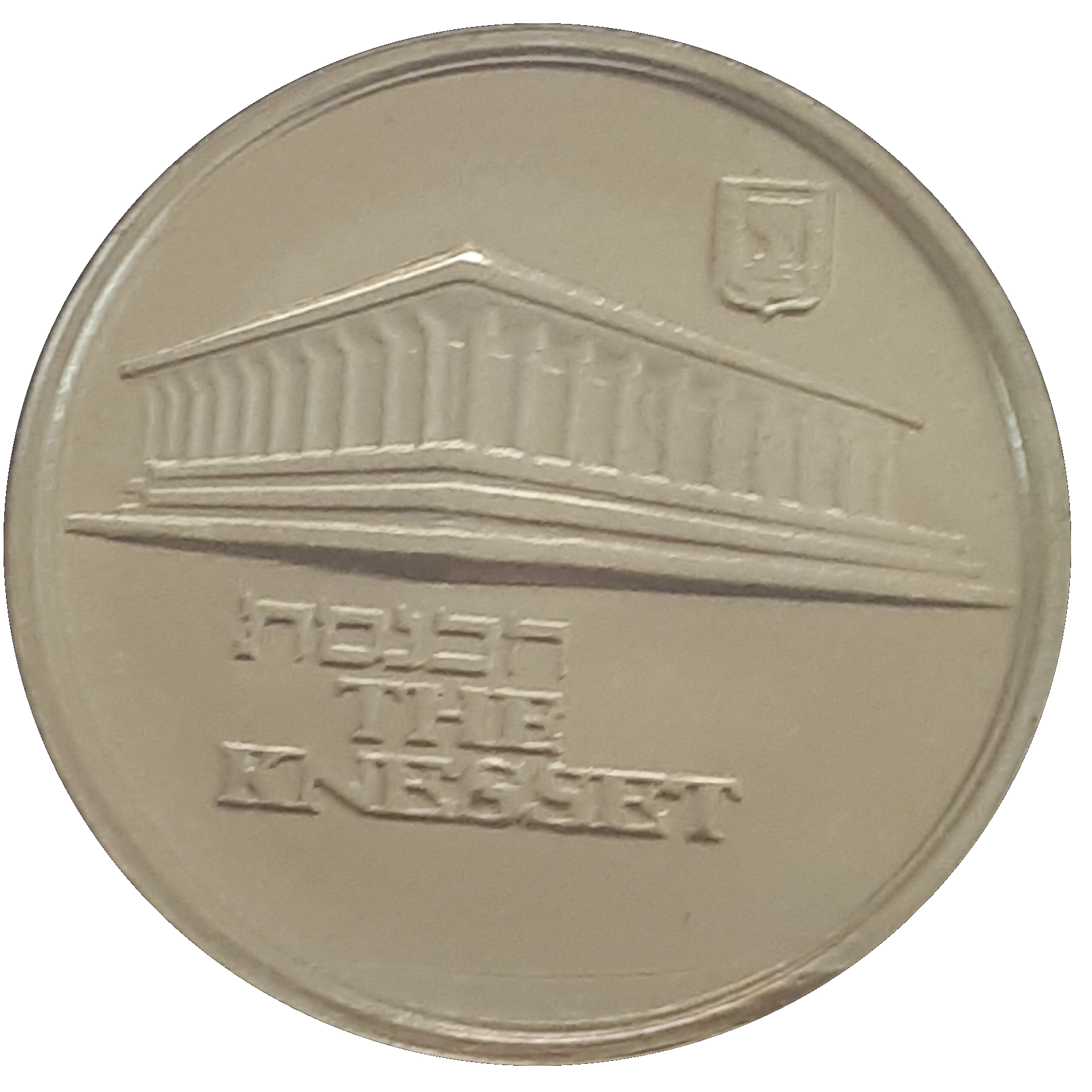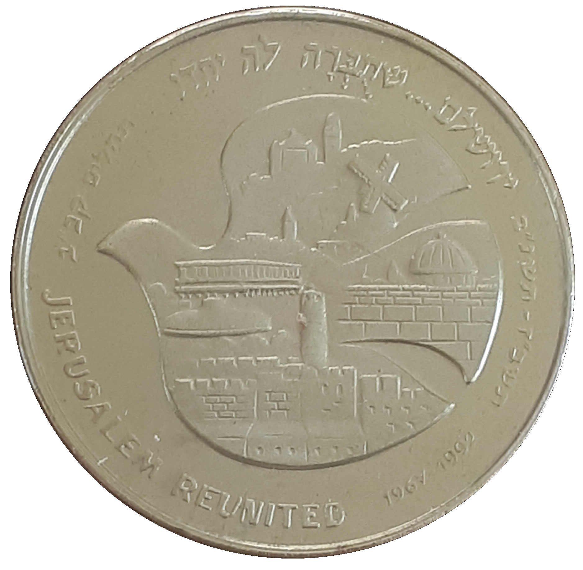 Опис: Пам'ятки старого та нового Єрусалима в обрисах голуба миру. По краю монети напис «JERUSALEM REUNITED», 1967-1992 5727-5752 та напис на івриті «Єрусалим — місто, збудоване як міцно з'єднане, Псалми 122».