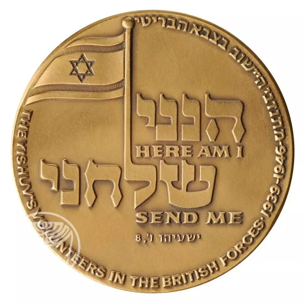 Опис: У центрі — вірш «Ось я, пошли мене» (Ісая 8:1) на івриті та англійською мовою, а також піднятий ізраїльський прапор. Напис на обідку: «Добровольці Ішува в британських збройних силах, 1939–1946» на івриті та англійською мовою.