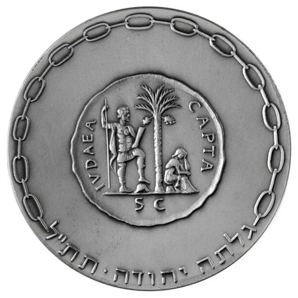 Опис: Дублікат римської монети, викарбуваної з нагоди завоювання Єрусалима Веспасіаном у 70 році н. е. Зліва — переможець Веспасіан; праворуч — жалісна єврейська жінка, що сидить під пальмою, символом Юдеї. На реверсі римської монети латинський напис «Judea Capta» (Юдея захоплена), а нижче літери S.C., що означають «Senatus Consultum» (за наказом Сенату). По краю медальйона — ланцюг, символ полону, та напис івритом «Юдея у вигнанні 3830 (70 р. н. е.)».