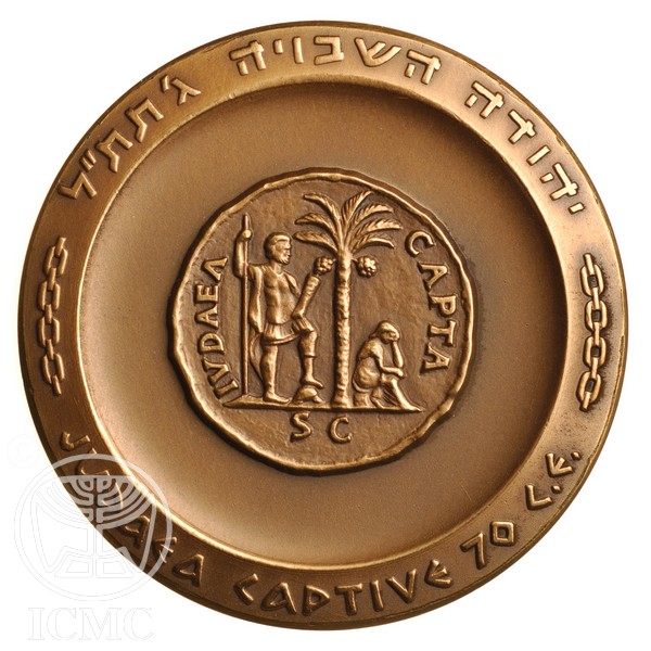 Опис: Усередині кругового втиску виділяється репліка римської монети, випущеної Веспасіаном на честь його перемоги над Юдеєю в 70 році н. е. У центрі монети зображена пальма з сімома гілками, на якій висять два грона плодів. (Пальма була добре впізнаваним символом Юдеї в ті часи і зустрічається на багатьох єврейських монетах). Ліворуч від дерева стоїть імператор у повному обладунку, а ліворуч від нього сидить єврейська жінка, яка оплакує. По краю римської монети латинський напис: «ludaea Capta» (Юдея в полоні). Нижче — ініціали, що означають «За наказом Сенату» (S.C.). По краю медалі — ланцюги, що символізують полон, та єврейський напис «Юдея в полоні 3830» і англійський напис: «Judaea Captive, 70 C.E.».
