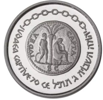 Опис: Зображення на реверсі монети зображує сторону монети, викарбувану римським імператором Веспасіаном у 71 році н. е. після перемоги над єврейським повстанням в Юдеї.