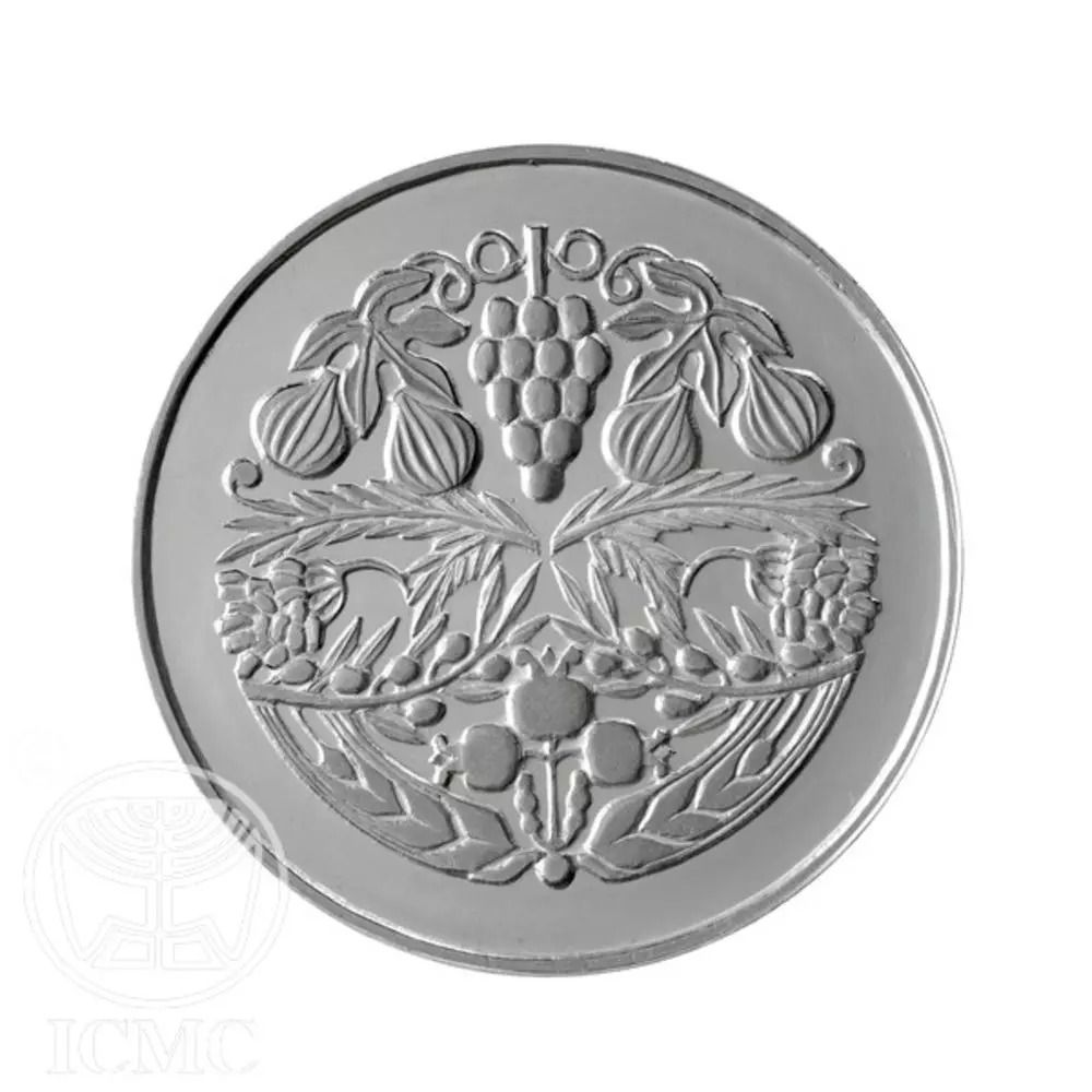 Опис: Зображення семи видів, якими благословенний Ізраїль, згідно з описом у Книзі Повторення Закону 8:8 «Країна пшениці та ячменю, виноградників, фігових дерев і гранатів, країна оливкових дерев і меду (фініків)» (Бехорім 1:3).