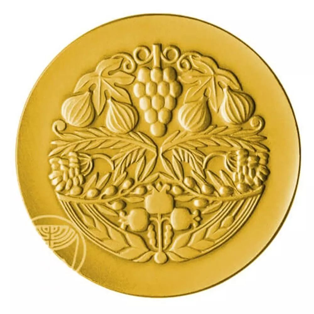 Опис: Зображення семи видів, якими благословенний Ізраїль, згідно з описом у Повторенні Закону 8:8 «Країна пшениці та ячменю, виноградників, фігових дерев та гранатів, країна оливкових дерев та меду (фініків)» (Бехорім 1:3).