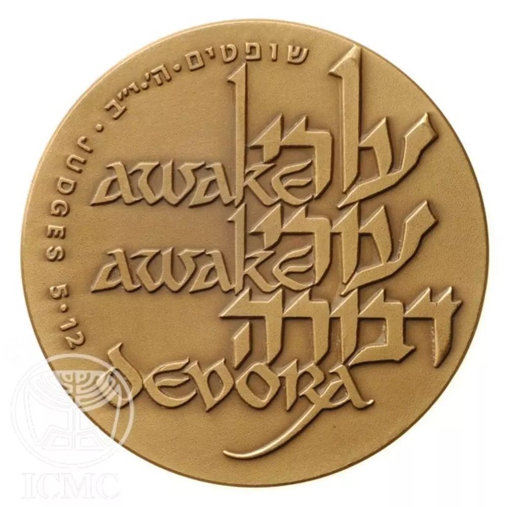 Опис: Цитата «Прокинься, прокинься, Дебора» (Суддів 5:12) стилізованими літерами, івритом та англійською мовою.