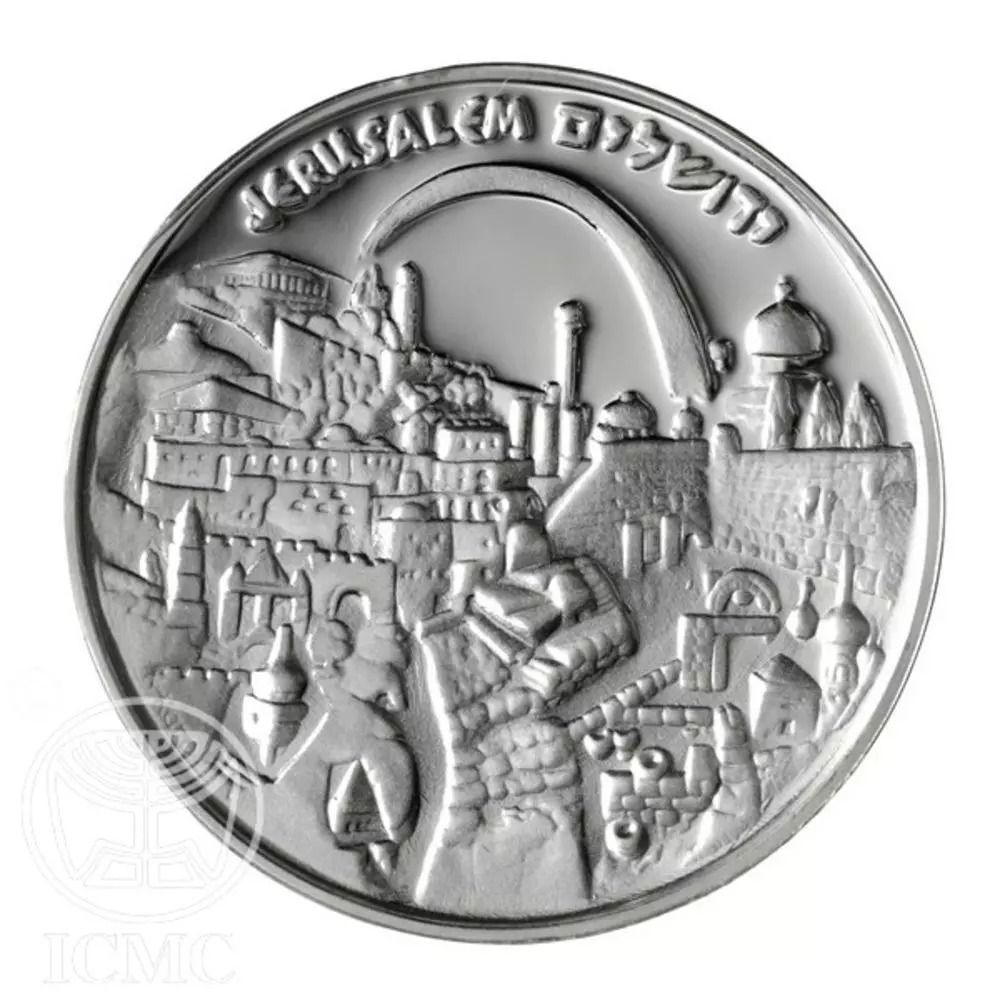 Опис: Пам'ятки в Єрусалимі: Західна стіна, Широка стіна з періоду Першого храму, Спалений будинок (будинок Катреса), Яд-Вашем — Меморіал пам'яті жертв і героїв Голокосту, Музей Ізраїлю та Купол Скелі. Над пам'ятками зображено арку, яка була частиною синагоги Хурва і символізує руйнування, але також служить знаком втіхи, відновлення та миру, як арка веселки в хмарах. Слово «JERUSALEM» (Єрусалим) на івриті та англійською мовою вздовж верхнього краю. (Дизайн схожий на дизайн медалі «Єрусалим-Париж» 1990 року).