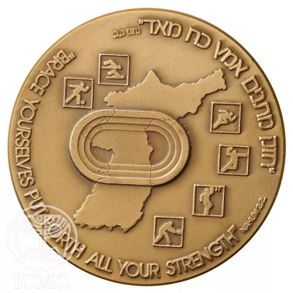 Опис: Олімпійський стадіон, що символічно об'єднує Північну і Південну Корею. Емблеми шести олімпійських видів спорту. Вірш «Зберіться з силами, викладіть усі свої сили» (Наум 2:2) на івриті та англійською мовою.
