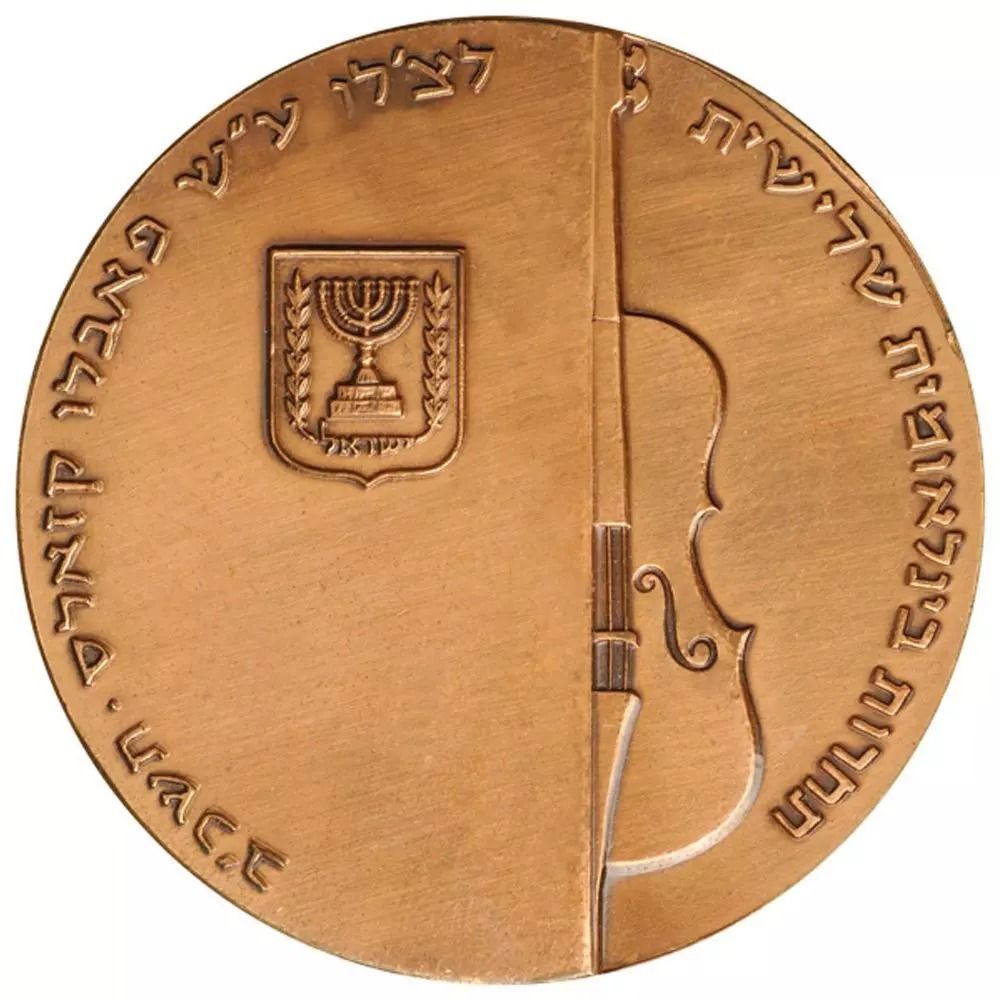Опис: У центрі зображено віолончель, що стоїть вертикально, частково прихована зліва панеллю, яка обрамлює державний герб. По краю монети розміщено напис «Третій Міжнародний конкурс віолончелістів імені Пабло Казальса 5722» на івриті.