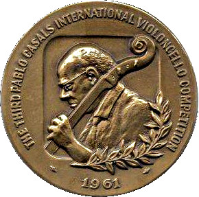 Опис: У центрі, у вибитому квадраті, зображено Касальса в півтоні, який тримає віолончель. У нижньому правому куті квадрата висить оливкова гілка. По краю монети розміщено напис англійською мовою «The Third Pablo Casals International Violoncello Competition 1961» (Третій Міжнародний конкурс віолончелістів імені Пабло Касальса 1961 року).
