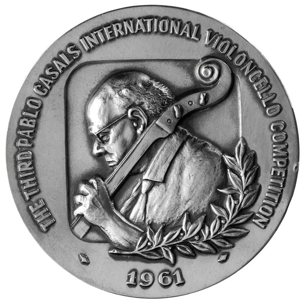 Опис: У центрі, у вибитому квадраті, зображено Касальса в півтоні, який тримає віолончель. У нижньому правому куті квадрата висить оливкова гілка. По краю монети розміщено напис англійською мовою «The Third Pablo Casals International Violoncello Competition 1961» (Третій Міжнародний конкурс віолончелістів імені Пабло Касальса 1961 року).