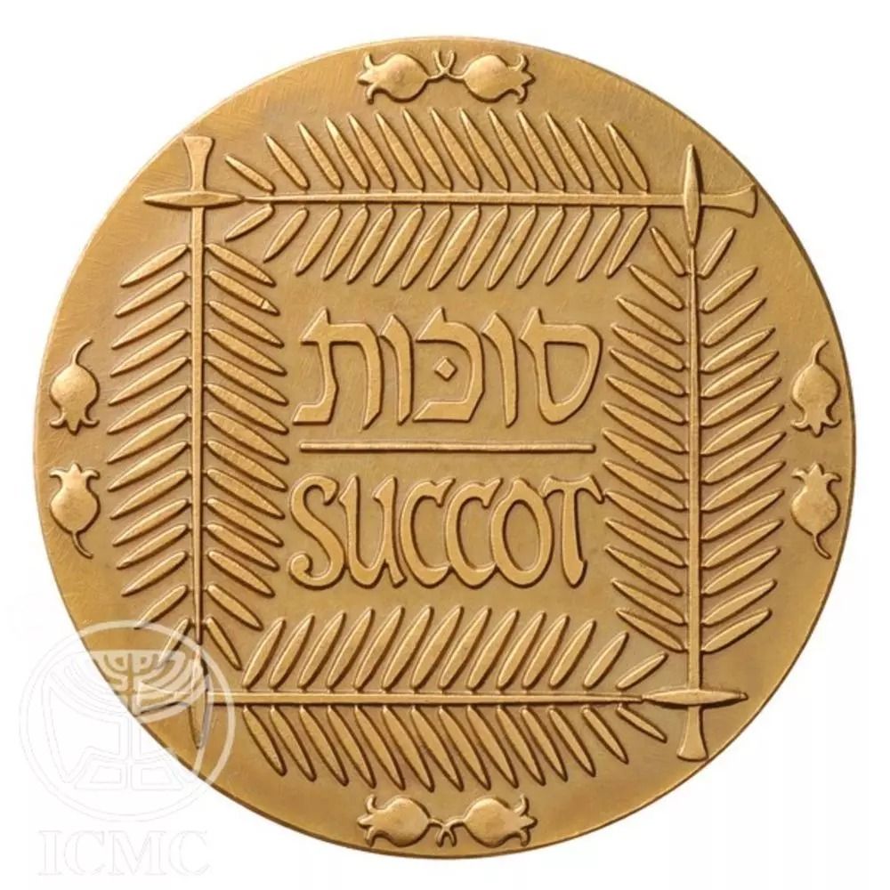 Опис: Напис «СУКОТ» на івриті та латиницею оточений чотирма пальмовими гілками, що утворюють контур сукки, з двома гранатами над кожною гілкою.