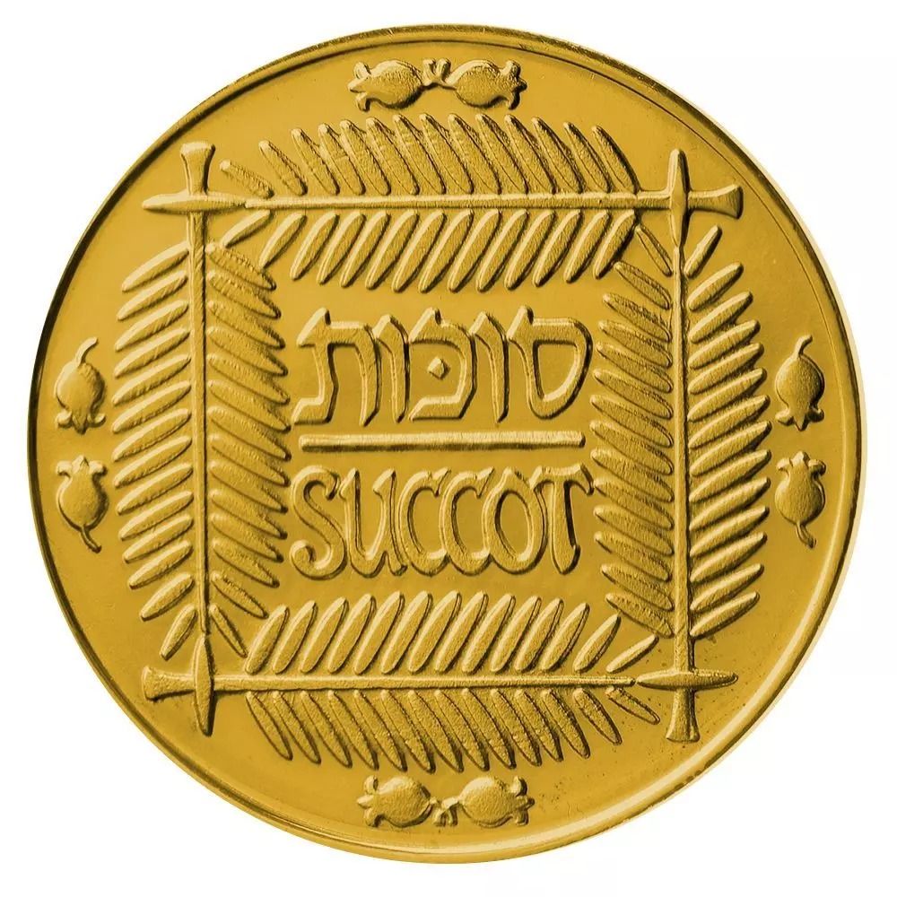 Опис: Напис «СУКОТ» на івриті та латиницею оточений чотирма пальмовими листками, що утворюють контур сукки, з двома гранатами над кожним листком.
