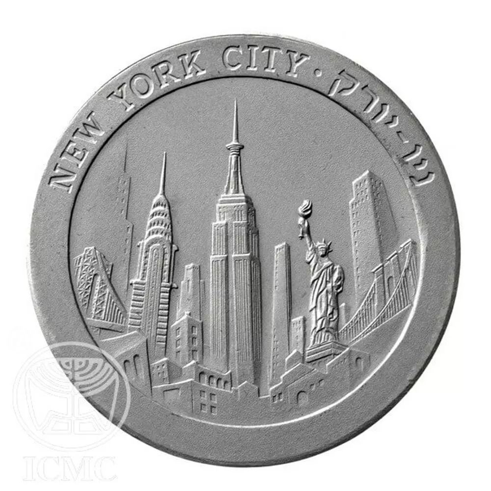 Опис: Панорама Нью-Йорка та Статуя Свободи. По колу зверху напис «NEW YORK CITY» на івриті та англійській мові.