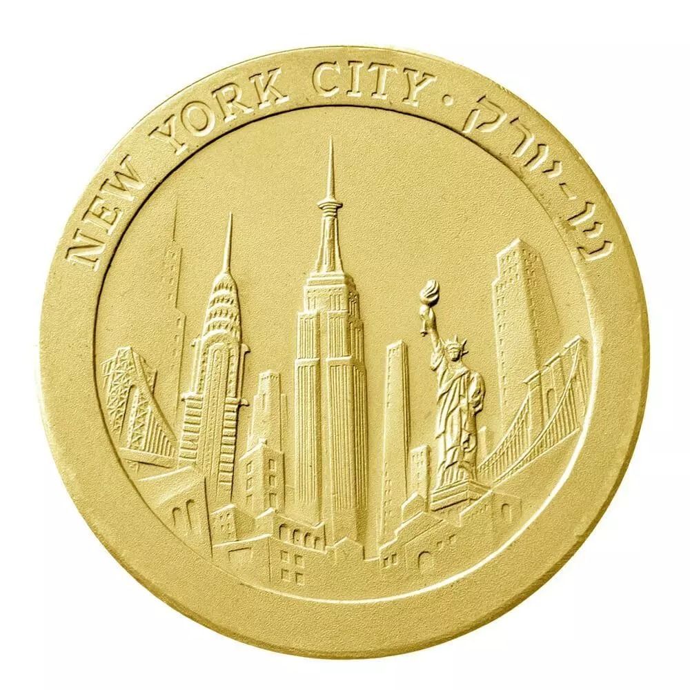 Опис: Панорама Нью-Йорка та Статуя Свободи. По колу зверху напис «NEW YORK CITY» на івриті та англійській мові.