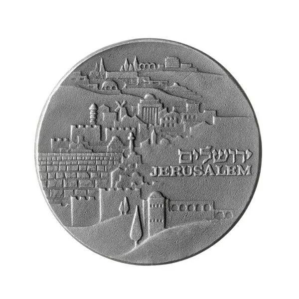 Опис: Стилізоване зображення Єрусалима, на якому виділяються його головні будівлі. Напис «Єрусалим» на івриті та англійською мовою.