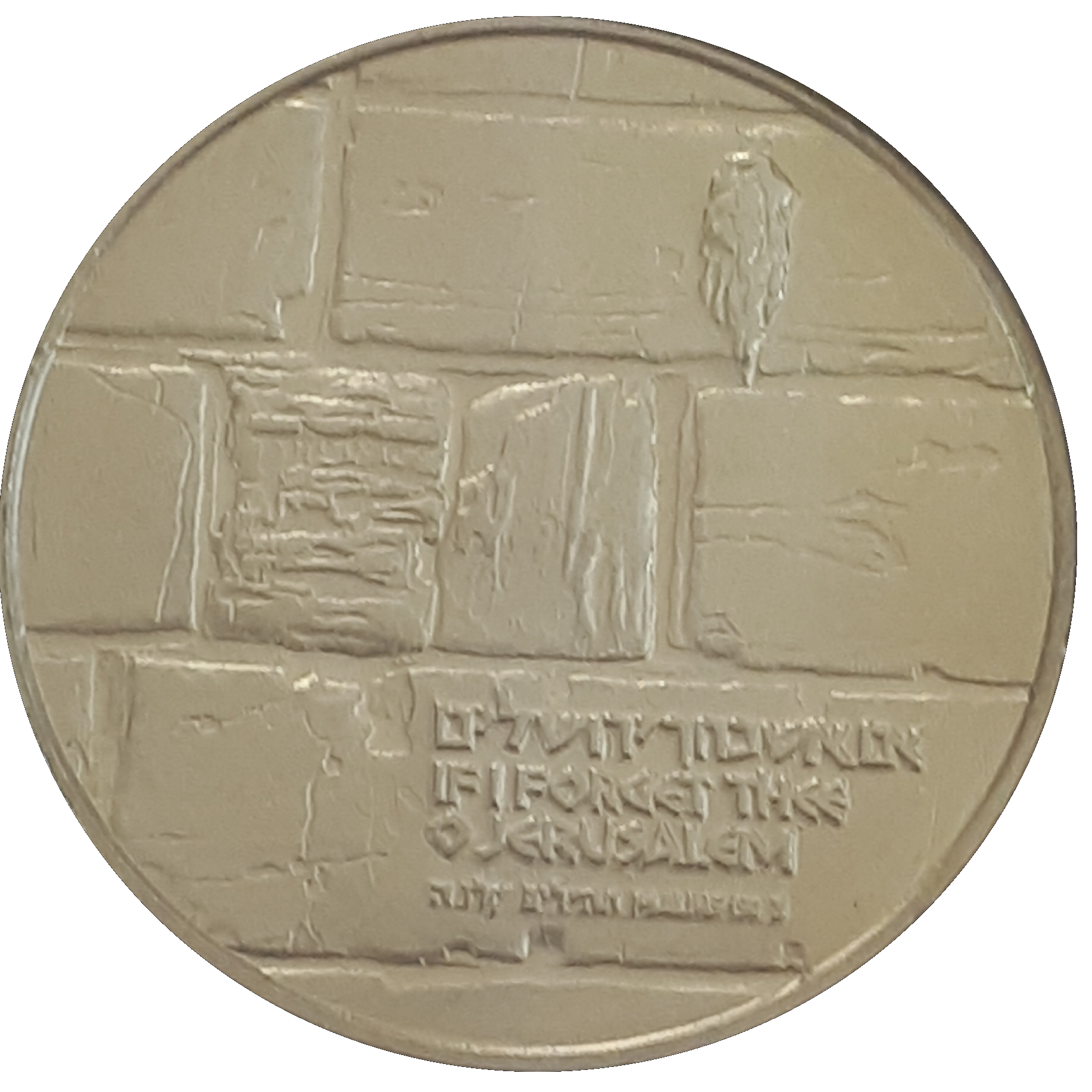 Опис: Камені Західної стіни з типовим для них мохом. На бронзових/томбакових і срібних медалях викарбувано напис «IF I FORGET THEE O JERUSALEM» (Якщо я забуду тебе, Єрусалиме) та джерело «Psalms 137:5» (Псалми 137:5) на івриті та англійській мові. На золотій медалі викарбувано напис без джерела.