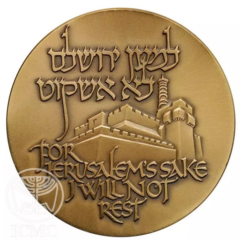 Опис: У центрі — стилізована форма Вежі Давида. Зверху на івриті, а знизу англійською мовою напис: «Заради Єрусалима я не спочиватиму» (з Ісаї 62:1).
