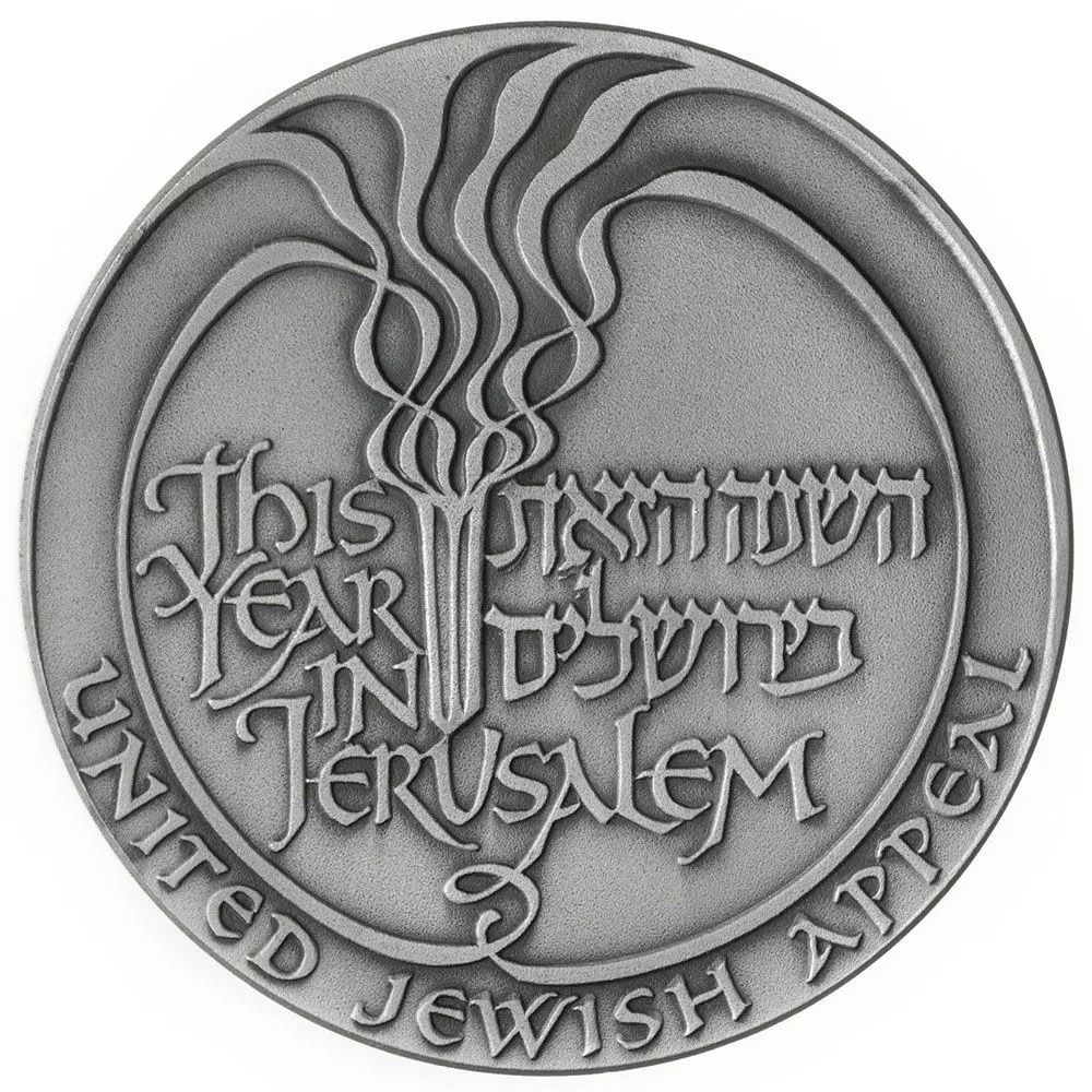 Опис: У центрі напис, що утворює полум'я факела: «Цього року в Єрусалимі» на івриті та англійською мовою. У нижній частині обідка англійською мовою «United Jewish Appeal» (Об'єднаний єврейський заклик).