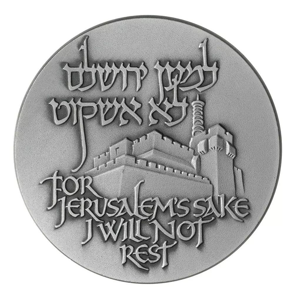 Опис: У центрі — стилізована форма Вежі Давида. Зверху на івриті, а знизу англійською мовою напис: «Заради Єрусалима я не спочиватиму» (з Ісаї 62:1).