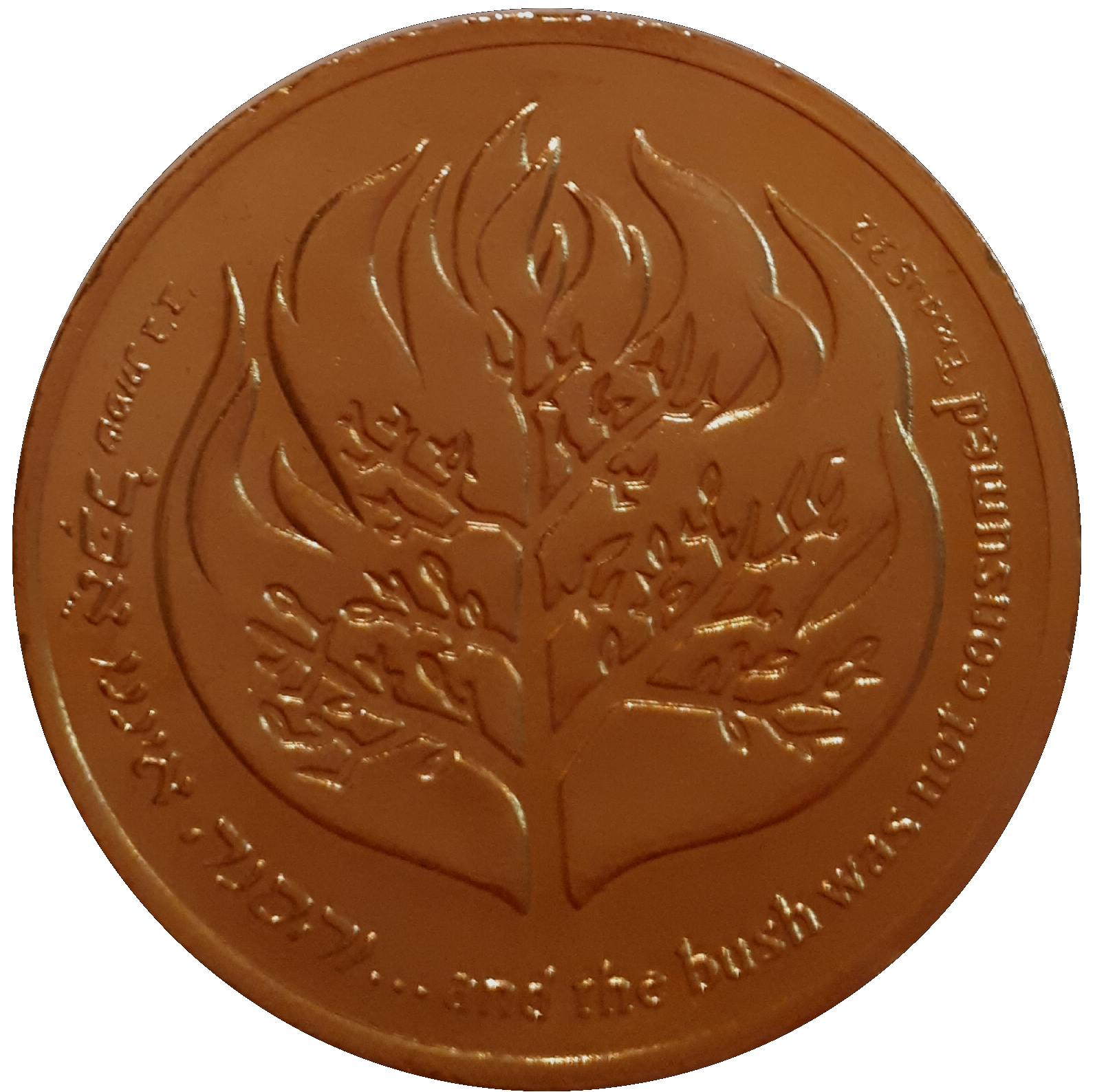 Опис: Вірш: «...і кущ не згорів» — Вихід 3:2 та його переклад англійською мовою. У центрі зображений палаючий кущ, що нагадує нам про обіцянку Бога Мойсею, нашому Рабі: як кущ горить і не згорає, так і жоден чоловік чи народ у світі не може знищити Ізраїль.
