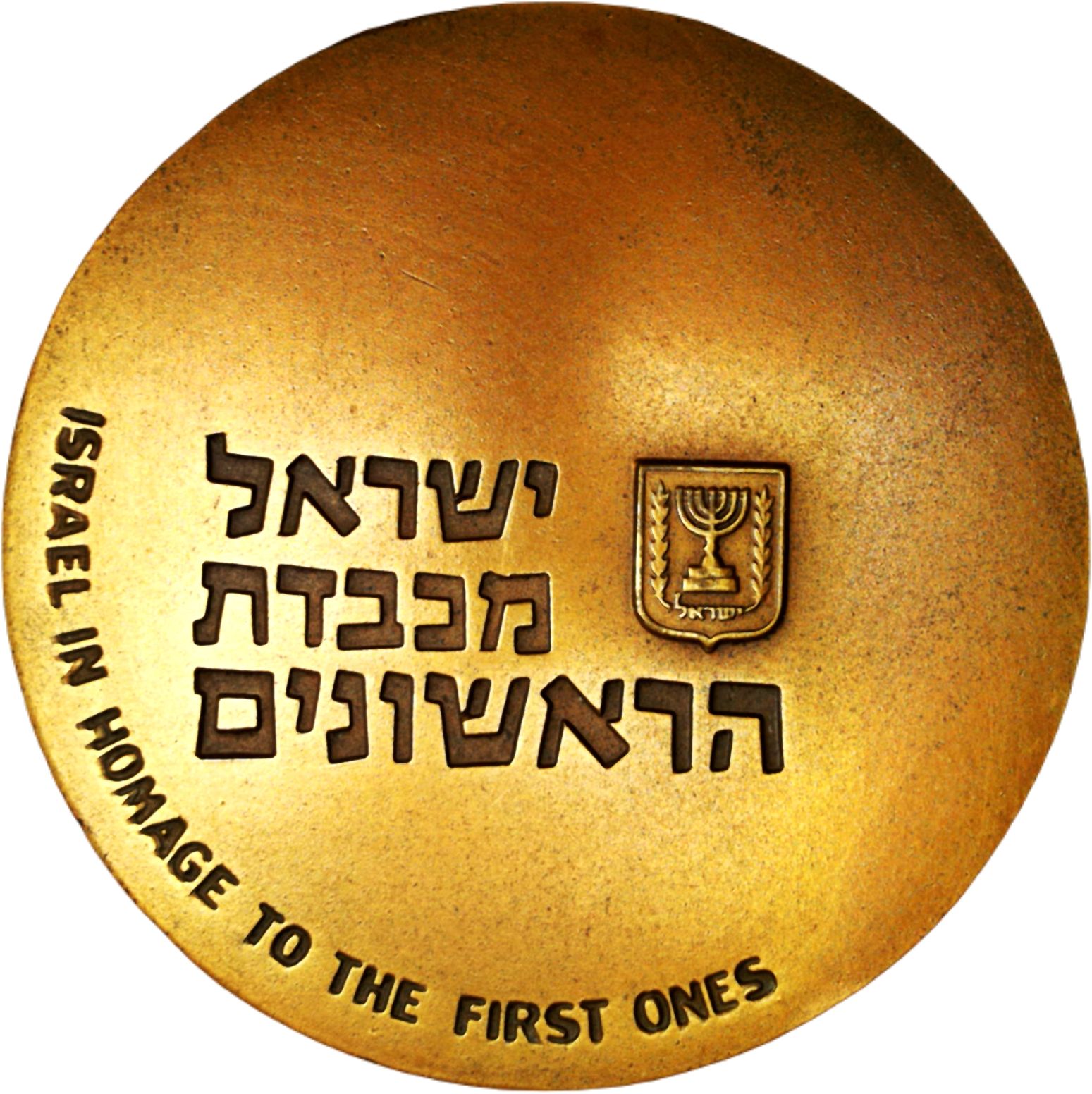 Опис: Справа — державний герб. У центрі — напис у вигляді заглиблених літер: «Ізраїль вшановує Перших». Напівколо по краю — рельєфні літери, ідентичний напис англійською мовою.