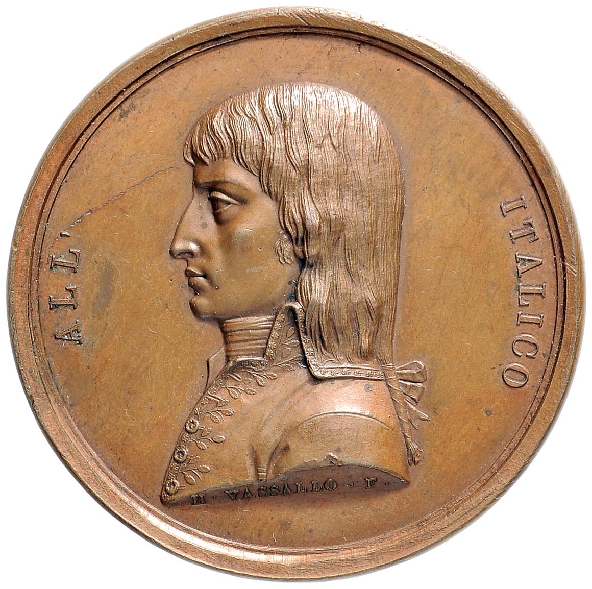 Опис: Бюст Наполеона зліва з довгим волоссям і хвостом, одягнений у мундир, прикрашений дубовим листям.