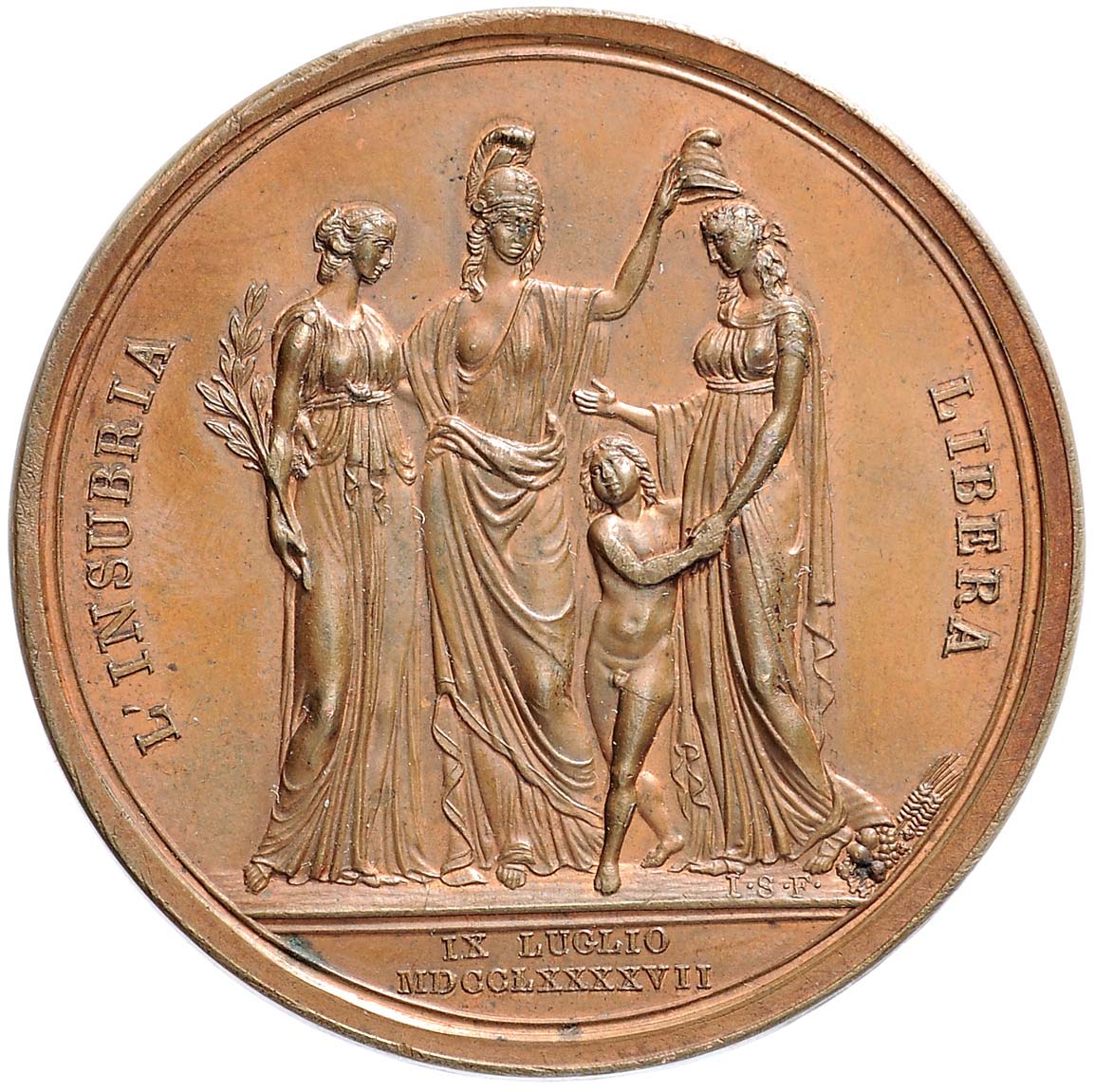 Вона надягає фригійський капелюх на голову Ломбардії, очолюваної генієм, під якою зображено ріг достатку.