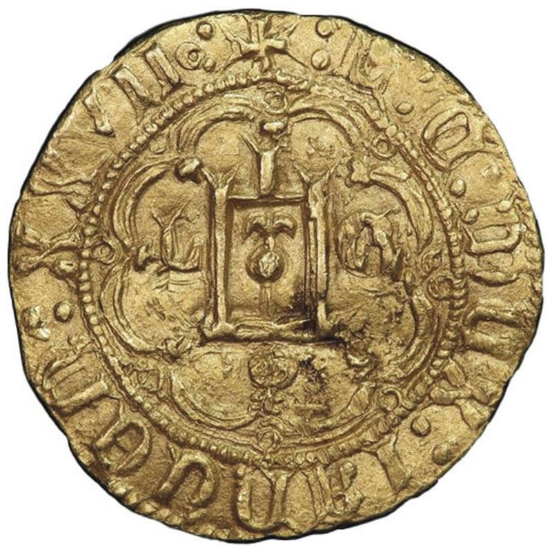 Опис: Ворота, що розділяють ініціали дожа, у багатопелюстковій формі, прикрашені трилисниками в кожній внутрішній точці, оточені намистиною.