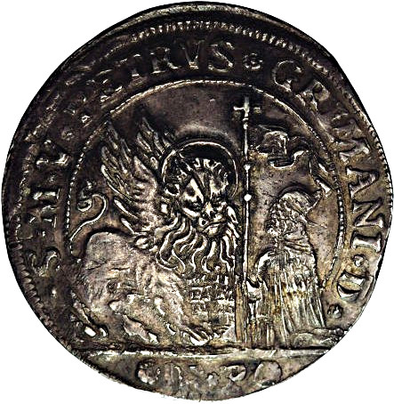 Опис: Лев Святого Марка ліворуч, дож, що стоїть на колінах праворуч, тримаючи посох з хрестом і прапором на вершині, ініціали монетника в екзергу.