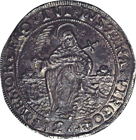 Опис: Повна фігура святої Юстини, що тримає пальмову гілку та книгу, на тлі, по обидва боки, корабель у морі та скелястий острів на горизонті, номінал «124» в екзергу.