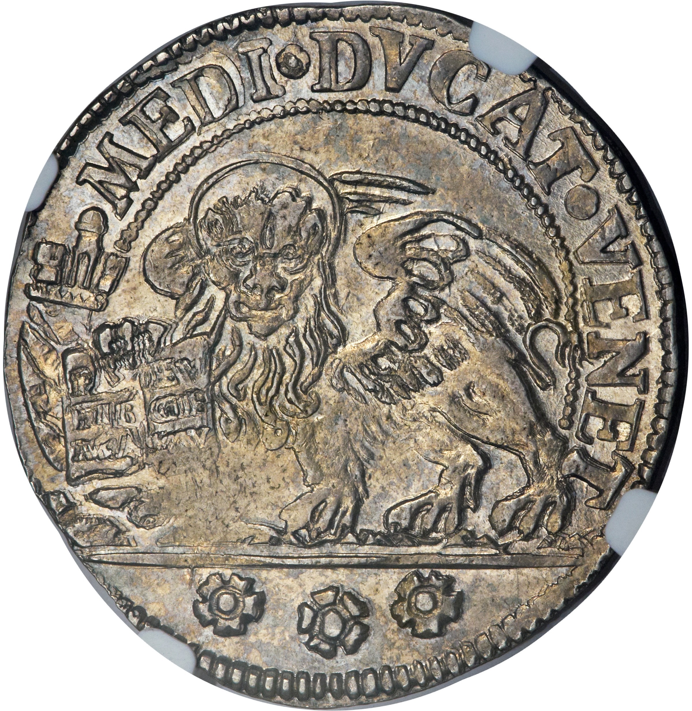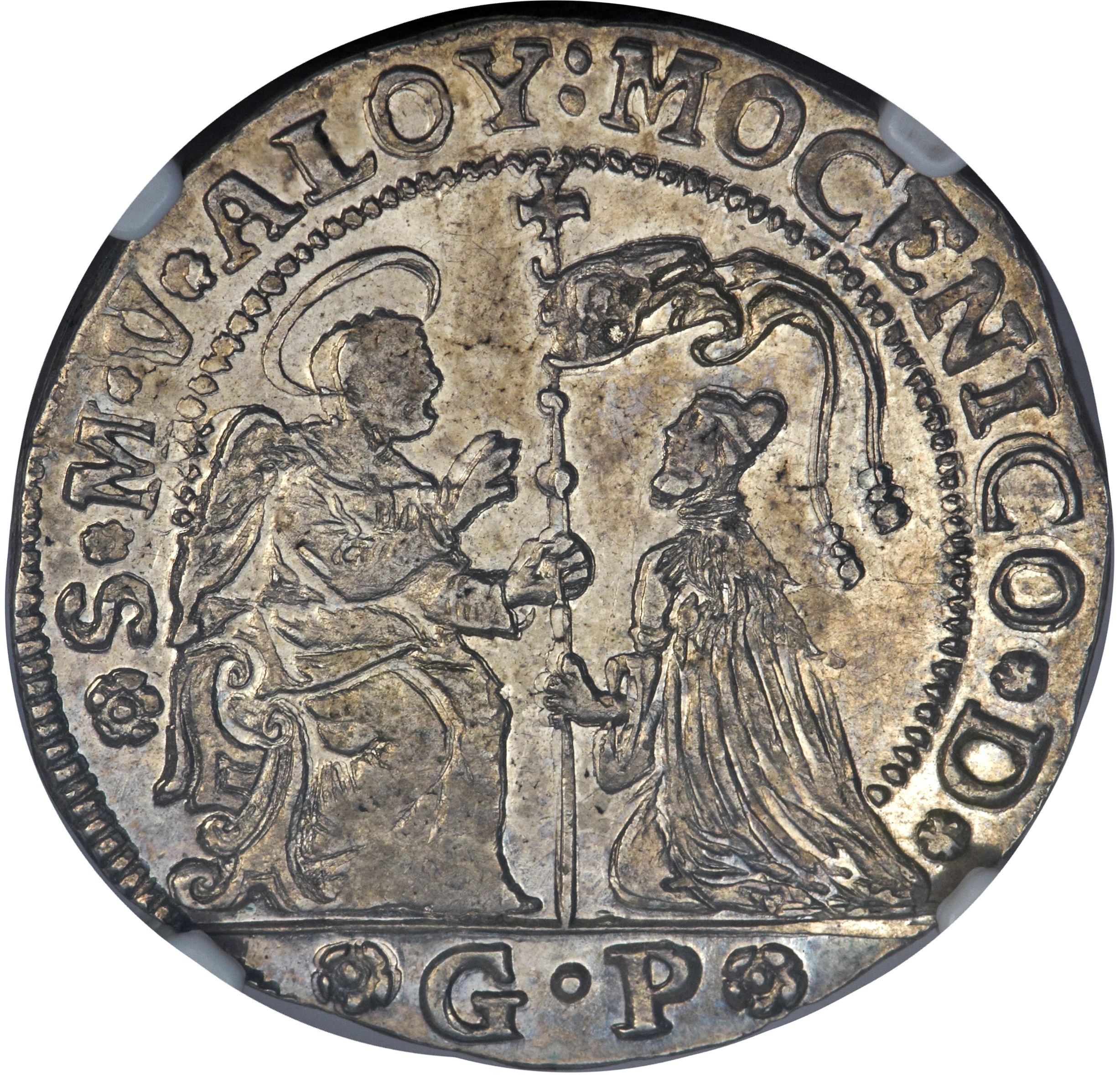 Опис: Святий Марк сидить ліворуч, подаючи посох з хрестом і прапором зверху до дожа, який стоїть на колінах праворуч, ініціали монетника в екзергу.