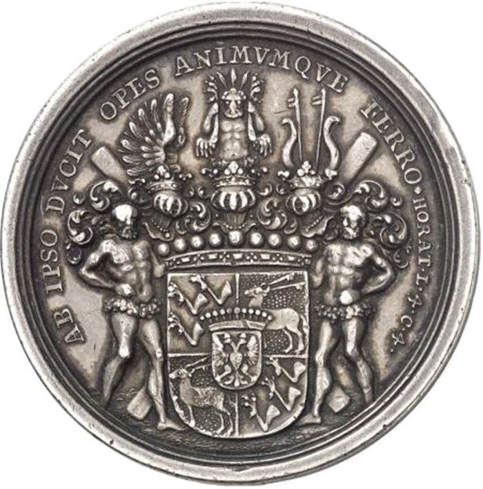 Опис: Герб, між двома стоячими Дикими Людьми, увінчаний трьома шоломами з гребенями.
