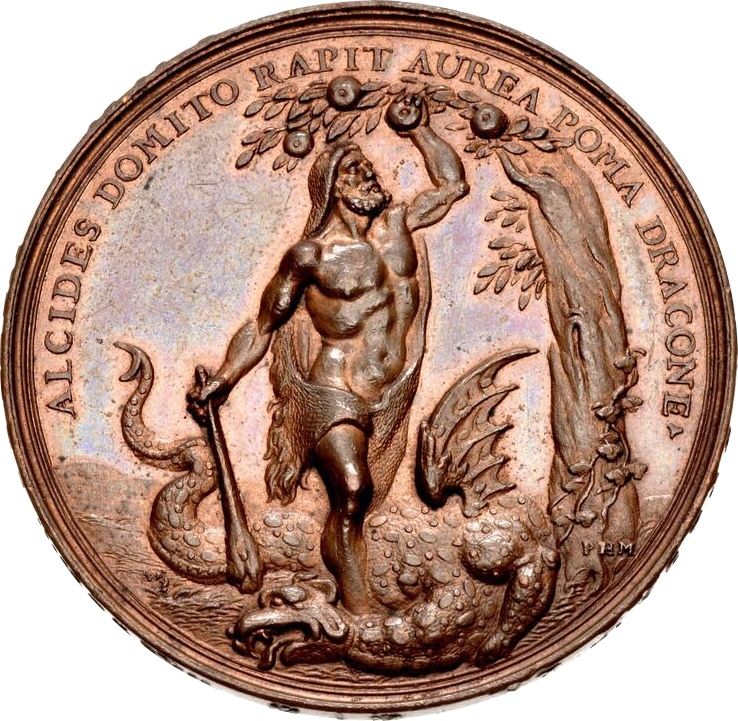 Опис: Геркулес, стоячи над переможеним драконом, зриває золоті яблука з дерева.