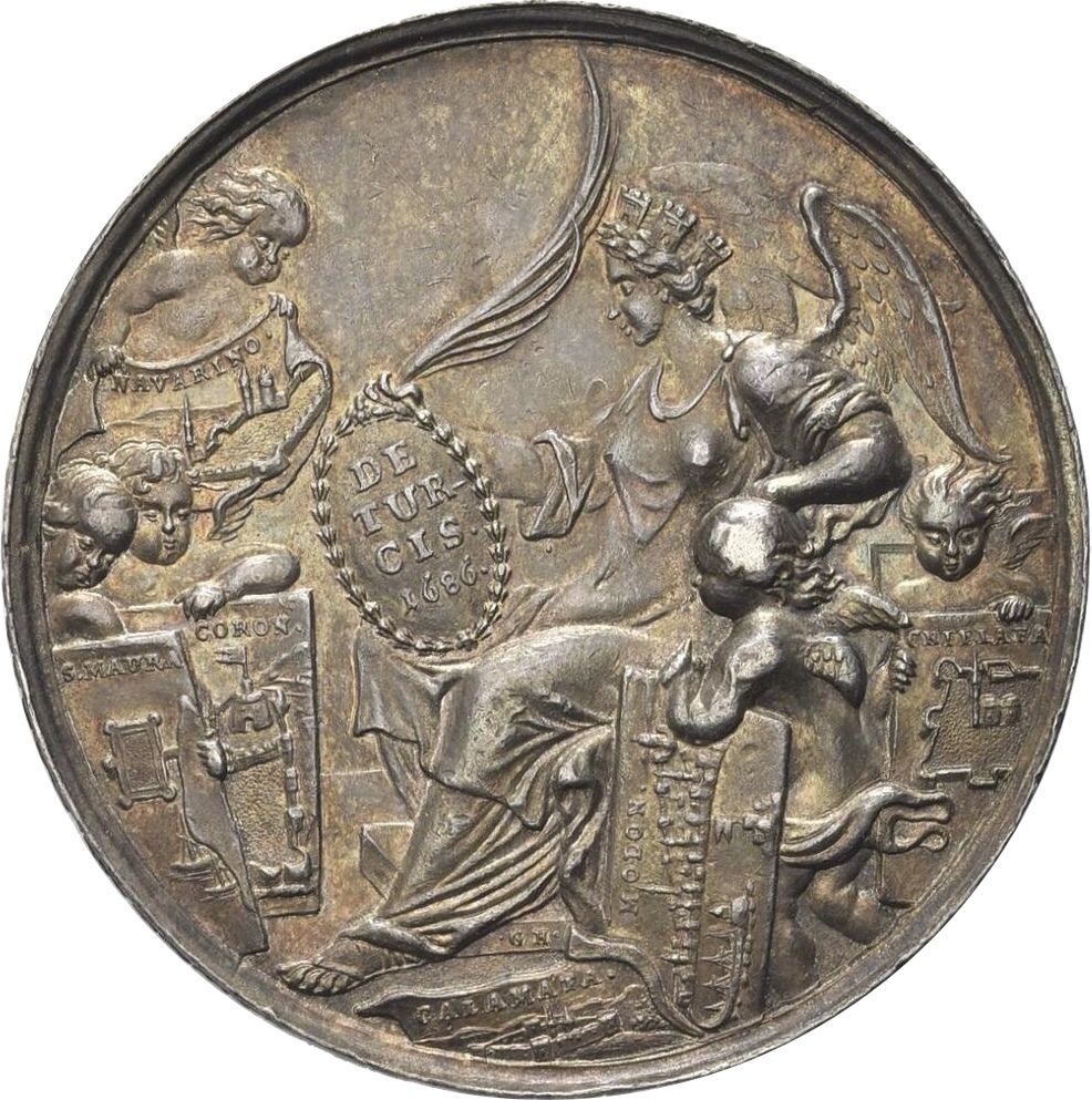 Опис: Крилатий путто, що стоїть на постаменті, тримає овали з портретами дожа Юстиніана та успішного генерала Морозіні; на постаменті зображено Румунію (Нафплію), а також двох путто, що тримають щити з зображенням фортець СКІМ.