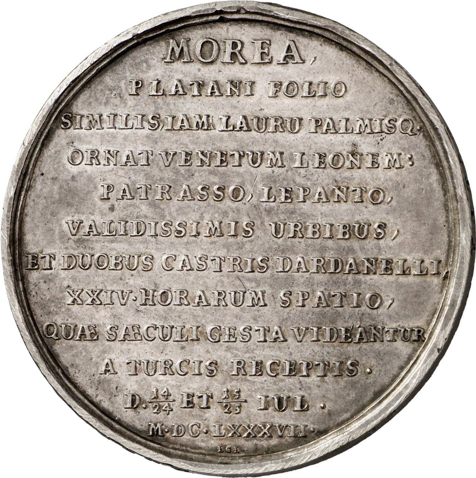 MOREA = PLATANI FOLIO = SILISIAM LAURU PALMISQ. = ORNAT VENETUM LEONEM: = PATRASSO, LEPANTO, = VALIDISSIMIS URBIBUS = ET DUOBUS CASTRIS DARDANELLI = XXIV HORARUM SPARTIO = QUAE SAECULI GESTA VIDEANTUR = A TURCIS RECEPTIS. = D 14/24 ET 15/25 IUL. = M • DC • LXXXVII •