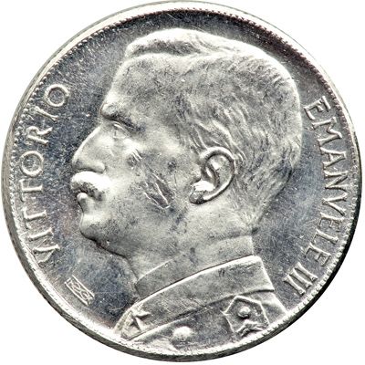 Опис: Бюст короля Вітторіо Емануеле III у парадній формі. Внизу, ліворуч, вузол у прямокутнику.