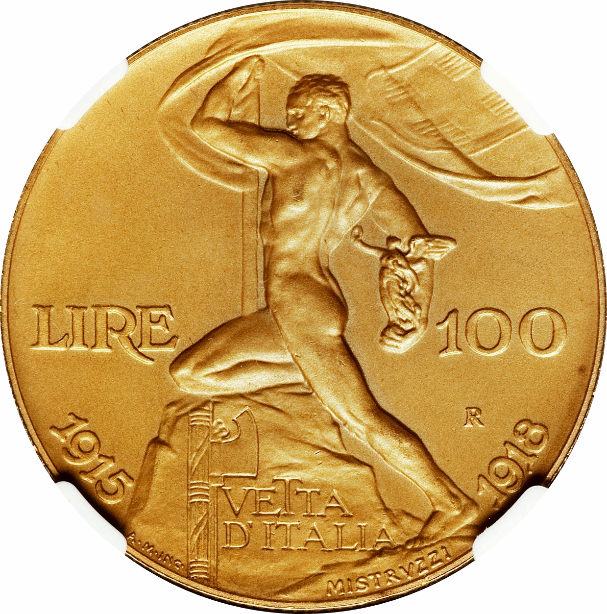 Опис: Фігура чоловіка, що біжить, з прапором Королівства Італія в правій руці та маленькою крилатою Вікторією в лівій, спирається коліном на скелю. На скелі викарбувано фасції та девіз «VETTA D'ITALIA», нижче — ім'я автора та ініціали гравера.