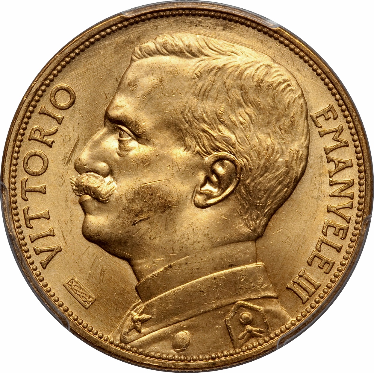 Опис: Бюст короля Вітторіо Емануеле III у парадній формі. Нижче, ліворуч, вузол у прямокутнику.