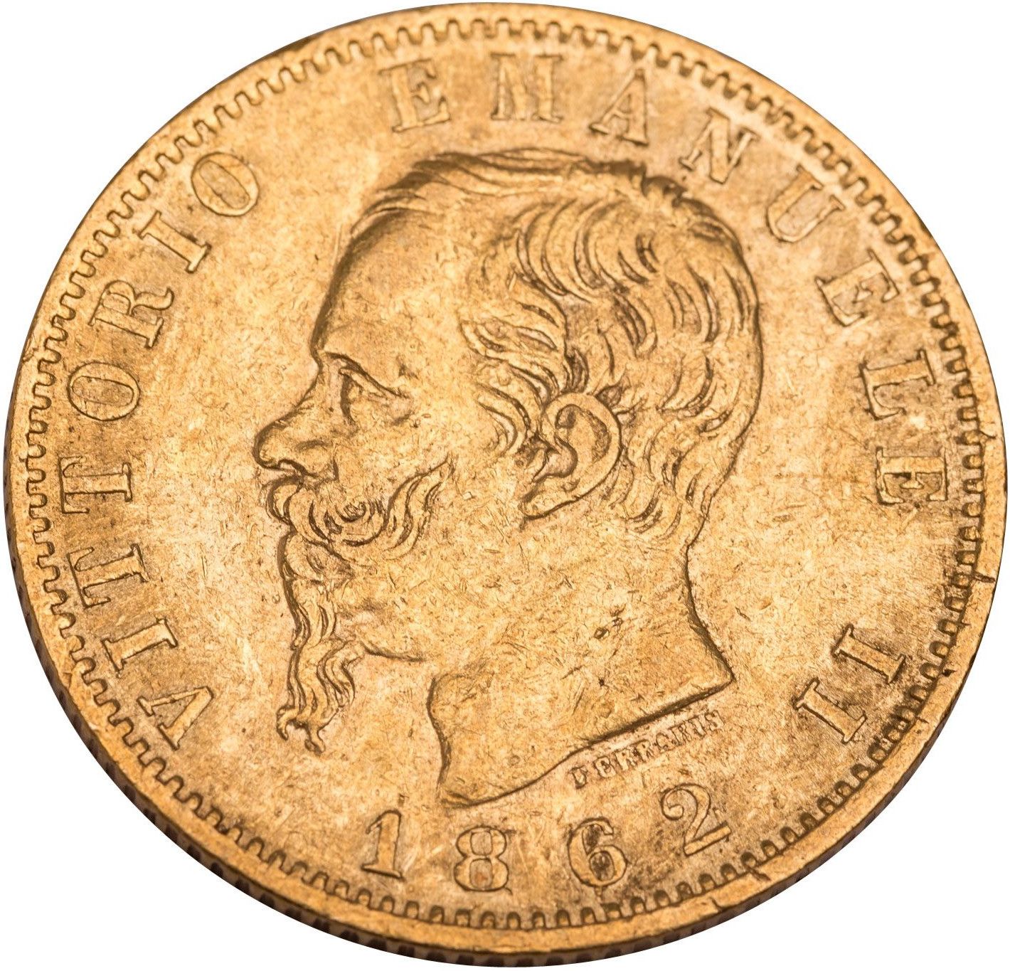 Опис: Голова короля Вітторіо Емануеле II ліворуч. Під шиєю — ім'я гравера.
