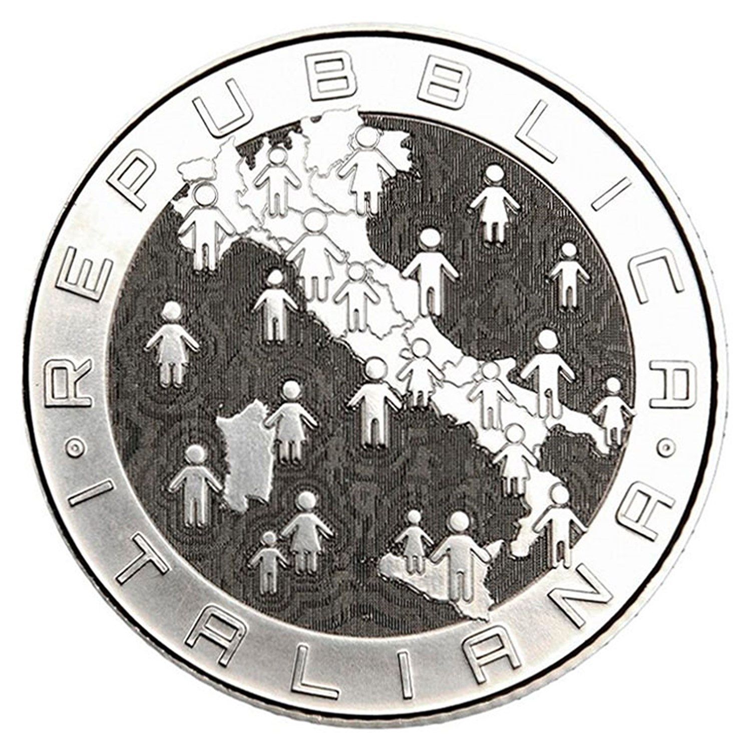 Опис: Профіль Італії з піктограмами чоловічих і жіночих фігур, що символізують демографічне зростання за допомогою ефекту прихованого зображення. Навколо – «REPUBBLICA ITALIANA».