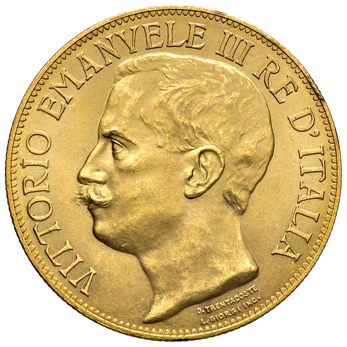 Опис: Голова короля Вітторіо Емануеле III, звернена вліво.