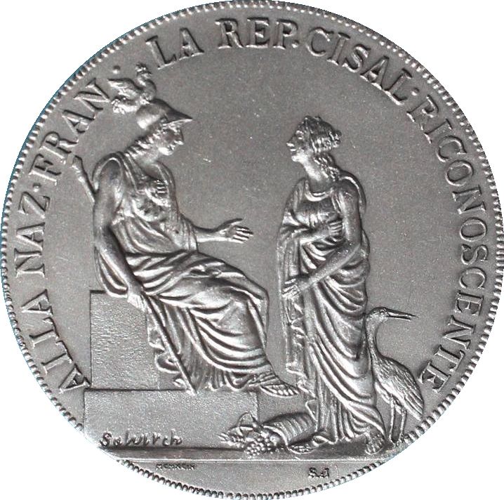 Опис: Жіноча фігура — алегорія Цизальпійської республіки — віддає шану сидячій Франції. Біля підніжжя Цизальпійської республіки праворуч зображено лелеку (символ відданості), а ліворуч — ріг достатку (символ достатку). На основі трону Франції викарбувано ім'я автора.