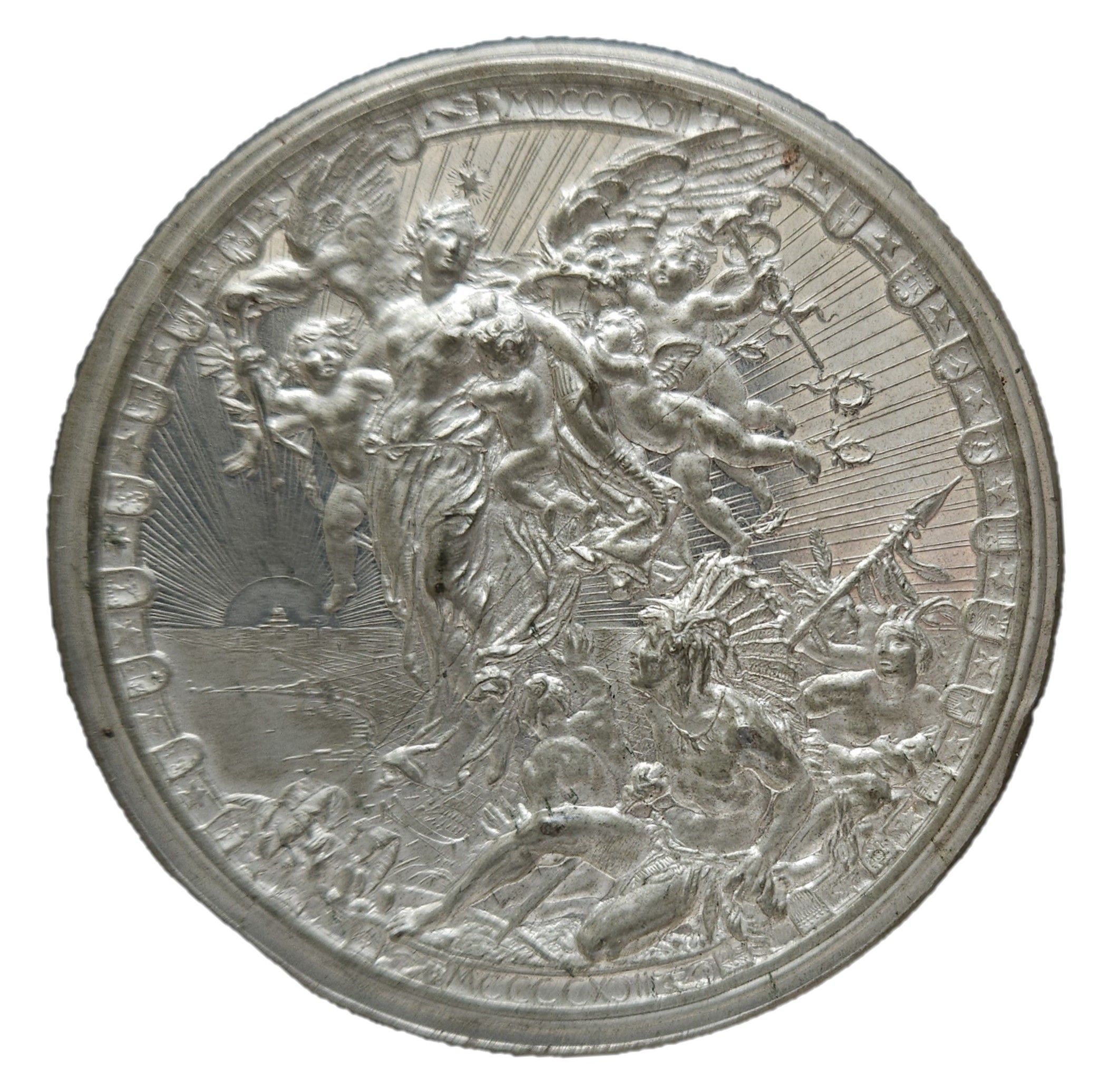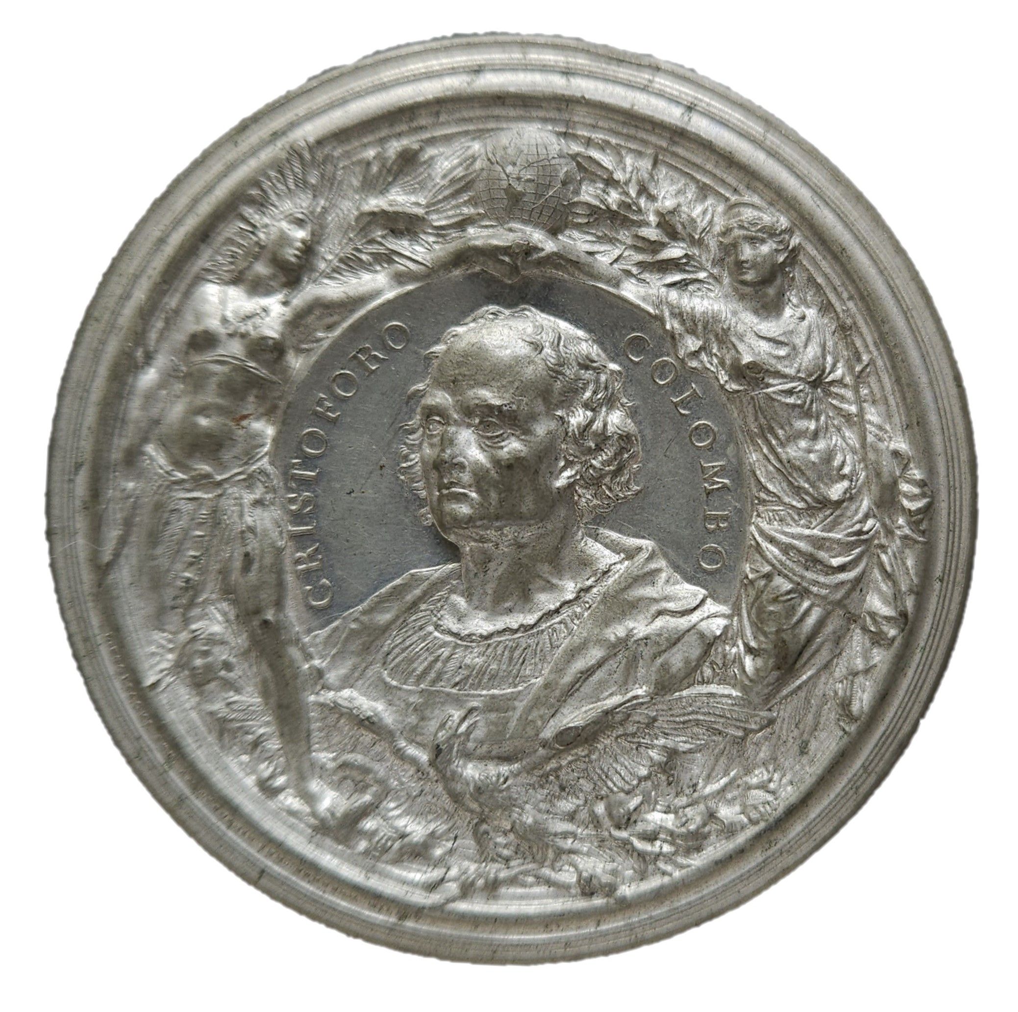 Опис: Бюст Колумба, звернений вліво, оточений алегоричними фігурами Америки та Європи, які тримаються за руки серед лаврових і пальмових гілок, глобус вгорі.