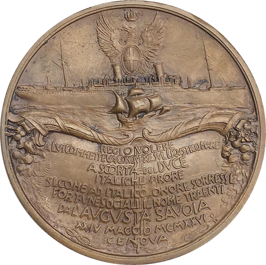 Опис: Коронований орел із щитом Савойї над двома кораблями, один із яких є сучасним круїзним кораблем, а інший — «Санта-Марія», по боках два роги достатку, а нижче — 9-рядковий напис із датою римськими цифрами над фасціями.