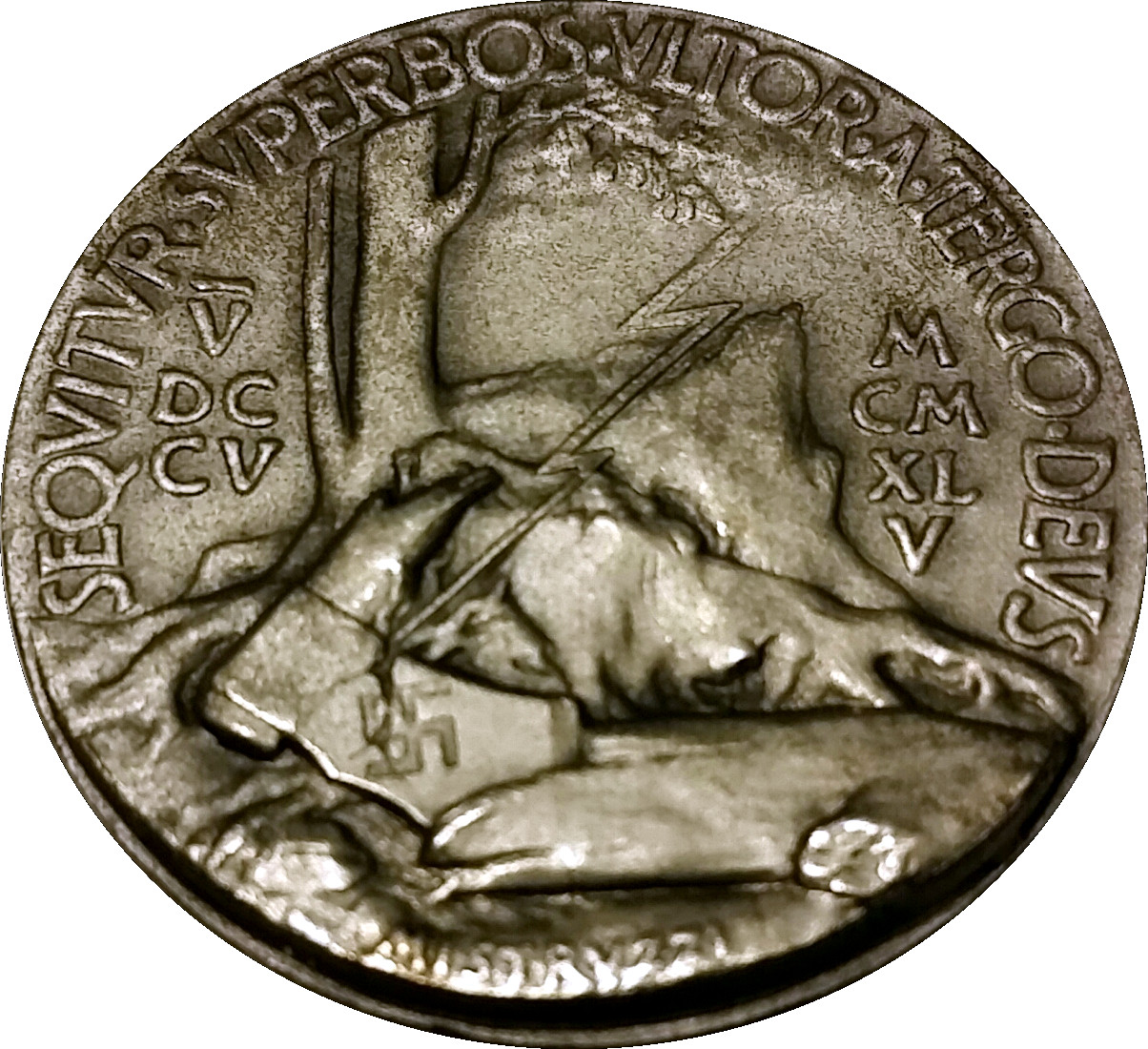 Опис: Блискавка, що вдаряє і розколює сокиру зі свастикою, яка застрягла в зламаному дереві, на тлі росте молоде дерево, оточене латинським написом, дати римськими цифрами.