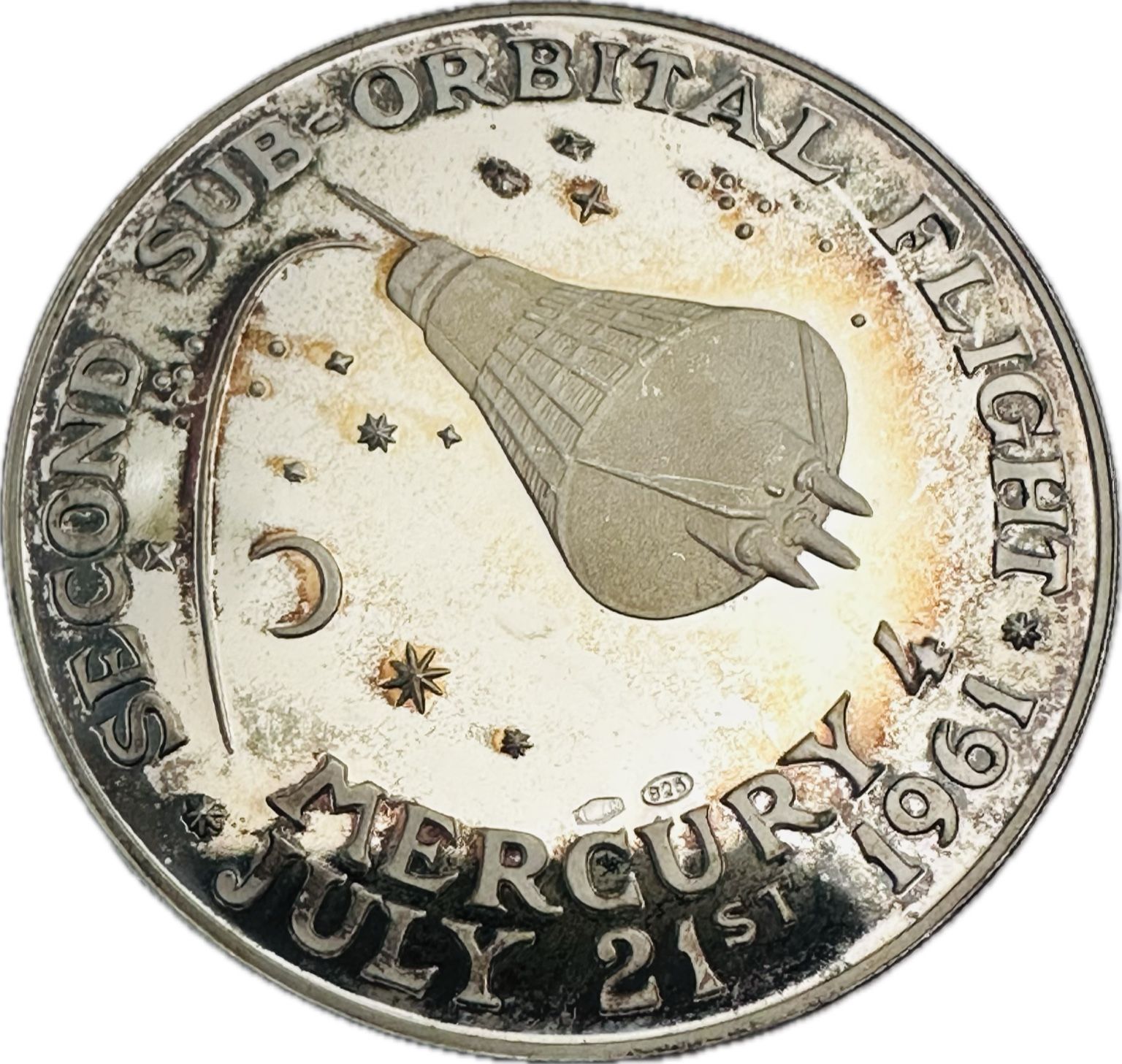 Опис: На звороті монети зображено місію «Меркурій-Редстоун 4» (MR-4), яка стартувала 21 липня 1961 року і стала другим суборбітальним космічним польотом американського астронавта. У центрі монети зображено капсулу «Меркурій» «Ліберті Белл 7», яка піднята носом вгору під гострим кутом, що підкреслює її параболічну траєкторію польоту.