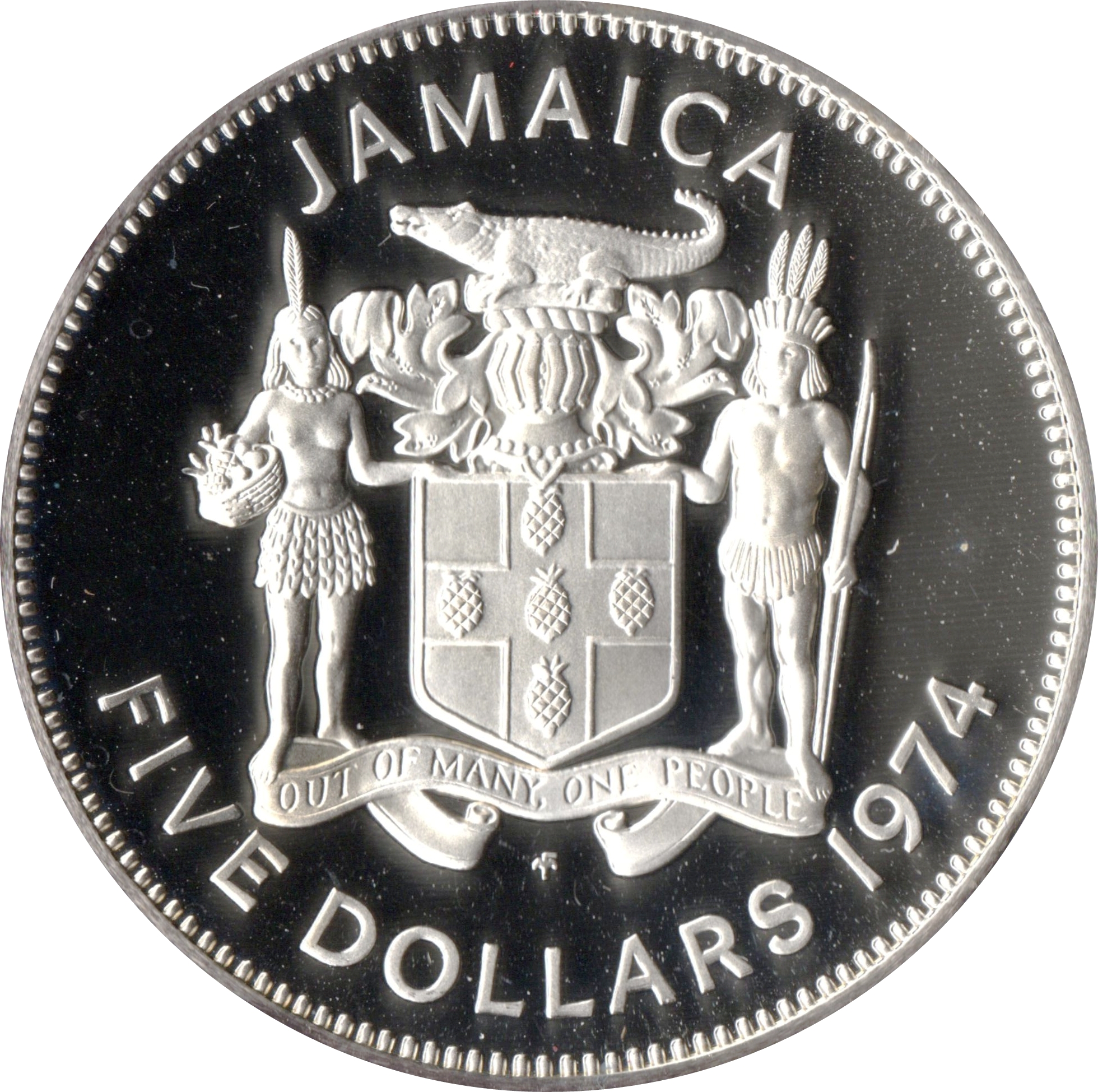 5 доларів (Норман В. Менлі; срібна проба; великий шрифт) 1974 – 1979 Ямайка