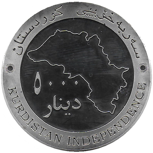 Опис: Курдський прапор накладено на карту Іракського Курдистану, а номінал 5000 динарів написано арабським шрифтом. Напис «KURDISTAN INDEPENDENCE» (Незалежність Курдистану) написано англійською та курдською мовами по периметру монети.