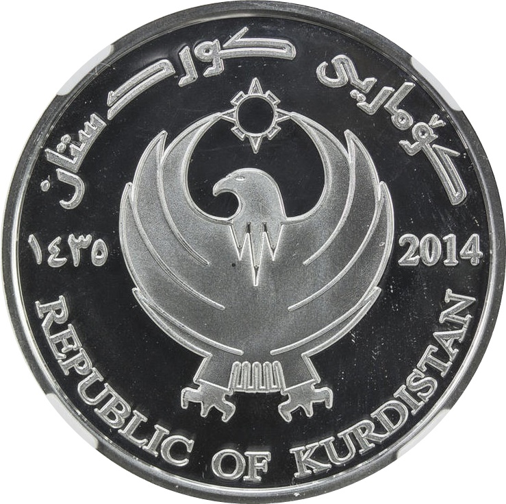 Опис: Зображення герба регіонального уряду Іракського Курдистану, григоріанський рік праворуч, рік за хіджрою ліворуч. Напис «REPUBLIC OF KURDISTAN» (РЕСПУБЛІКА КУРДИСТАН) англійською та курдською мовами по периметру монети.