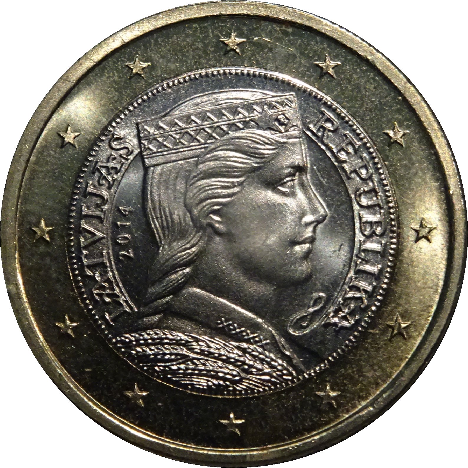 Опис: На аверсі монети зображено профіль латвійської народної дівчини, який спочатку був зображений на реверсі срібної монети номіналом 5 латів 1929 року. Зліва та справа монету частково оточують написи «LATVIJAS» та «REPUBLIKA». На зовнішньому кільці монети зображено 12 зірок Європейського Союзу.