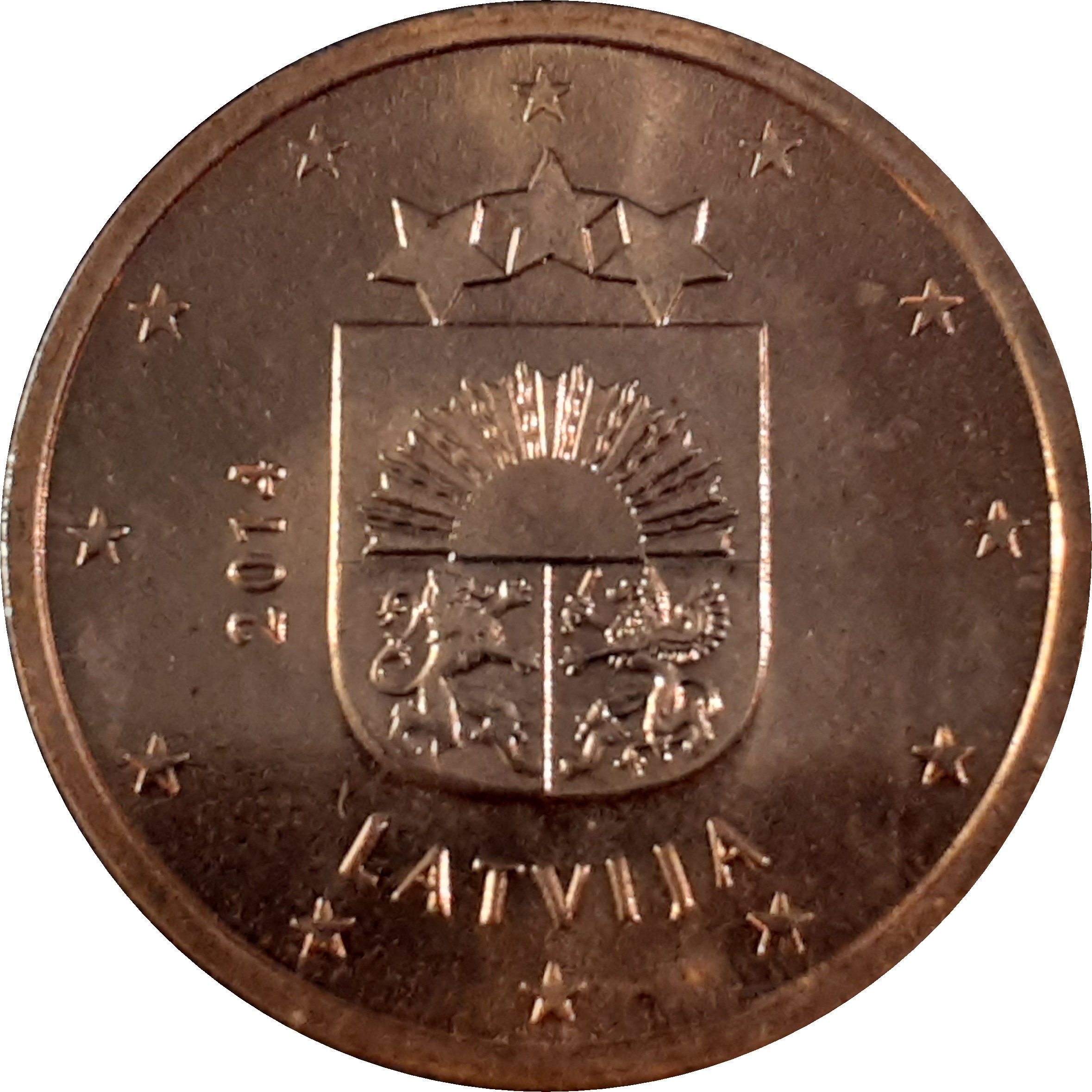 Опис: На аверсі монети зображено малий герб Латвійської Республіки, зліва — рік 2014, а під ним — напис «LATVIJA». На зовнішньому кільці монети зображено 12 зірок Європейського Союзу.